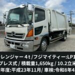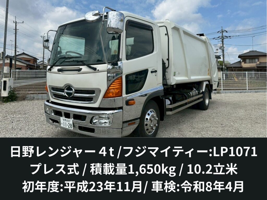 | 備考 | フジマイティー:LP1071・汚水タンク付き・プレス式・連続動作スイッチ・バックモニター搭載・6速マニュアル ・3ヶ月点検実施済み・架装物年次点検実施済み・車検:令和8年4月 *レンタカー使用の為、走行距離は増加する可能性があります。 |